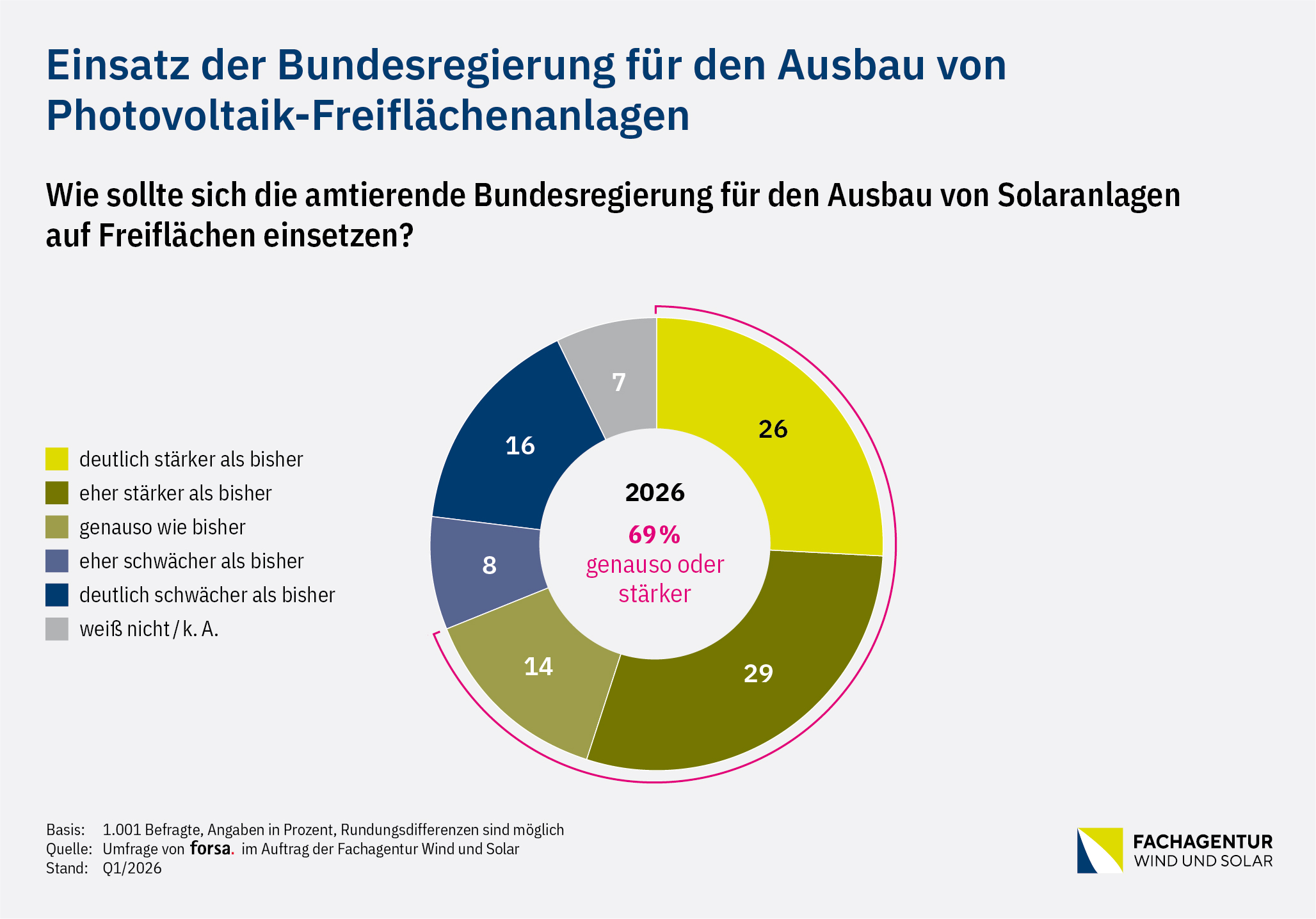 Berlin, 23.04.2026 – Rund 76 Prozent der Bevölkerung sind der Meinung, dass Deutschland erneuerbare Energien stärker ausbauen sollte. Das ist das Ergebnis einer repräsentativen Umfrage, die das Meinungsforschungsinstituts forsa im März 2026 im Auftrag der Fachagentur Wind und Solar durchgeführt hat. Ziel war es unter anderem, die Haltung zur energiepolitischen Zukunft Deutschlands sowie zu PV-Freiflächenanlagen zu erfassen.