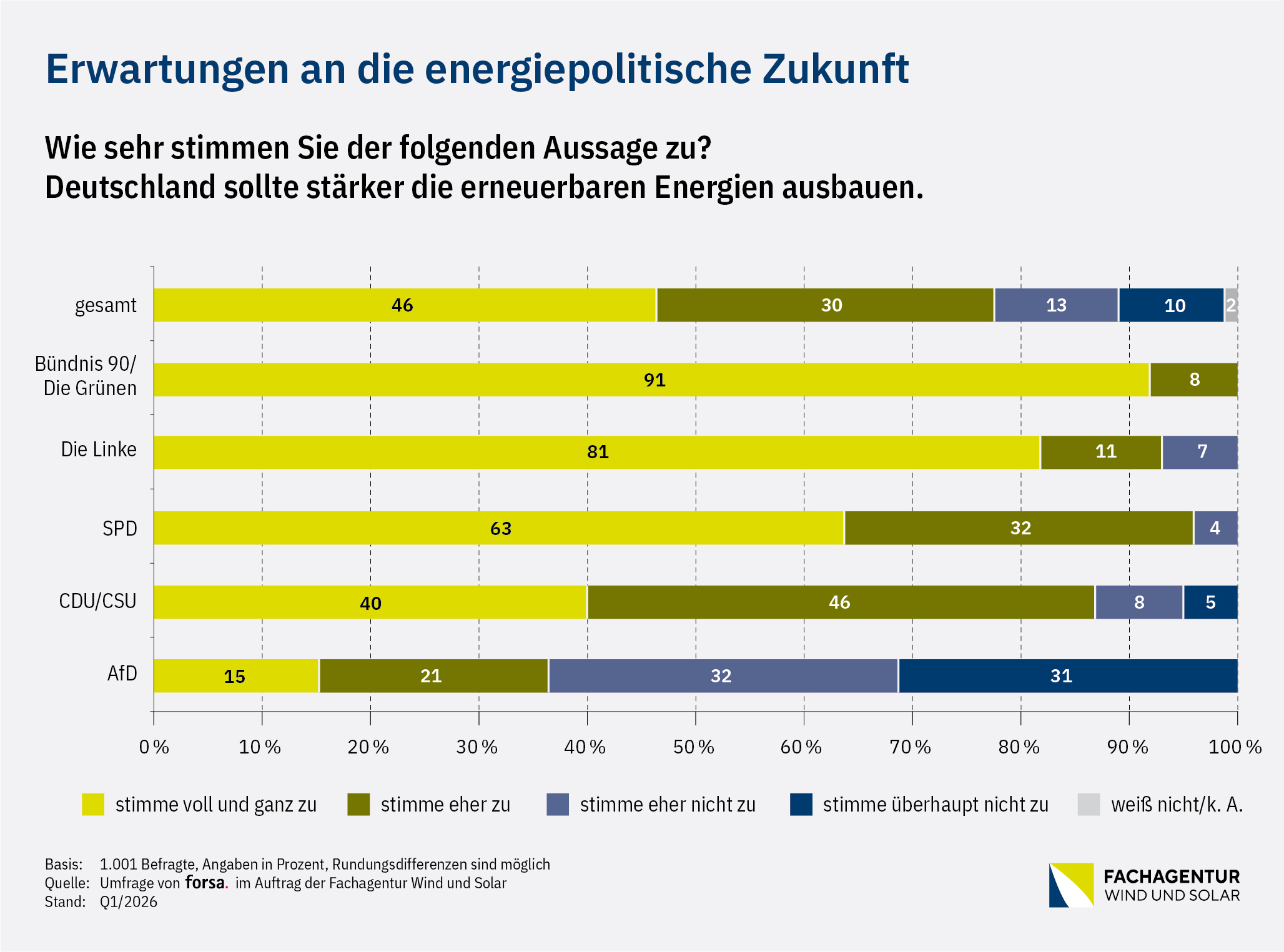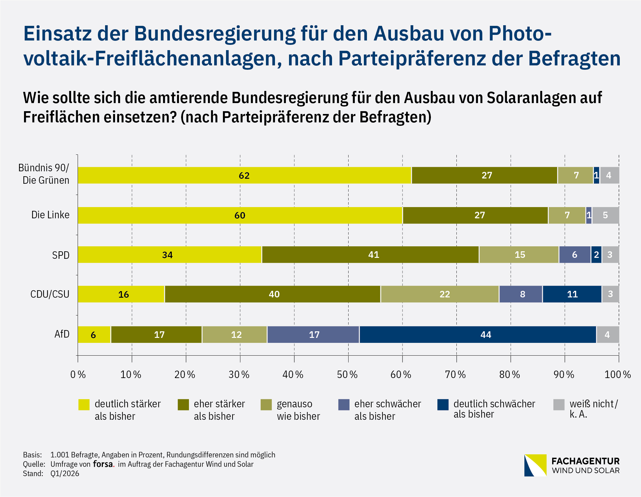Die repräsentative Umfrage wurde vom Meinungsforschungsinstitut forsa im Auftrag der Fachagentur Wind und Solar im Zeitraum vom 11. bis zum 23. März 2026 durchgeführt. Bundesweit wurden insgesamt 1.001 Menschen über 18 Jahre über ein repräsentatives digitales Onlinepanel mittels Fragebogen befragt.